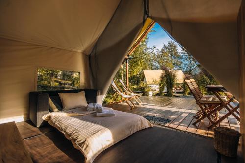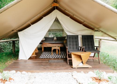 Near the famous Terme Olimia spa, Glamping Olimia Adria Village combines wellness and luxury. The safari-style tents are equipped with private bathrooms, air conditioning, and even personal hot tubs.